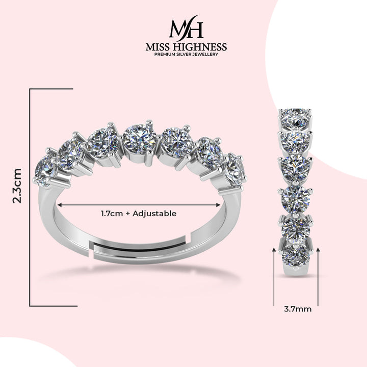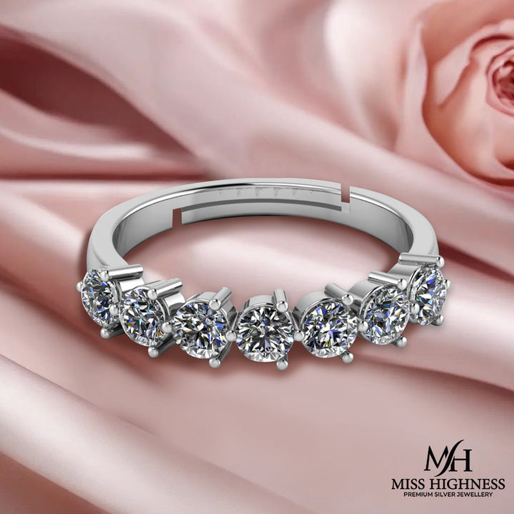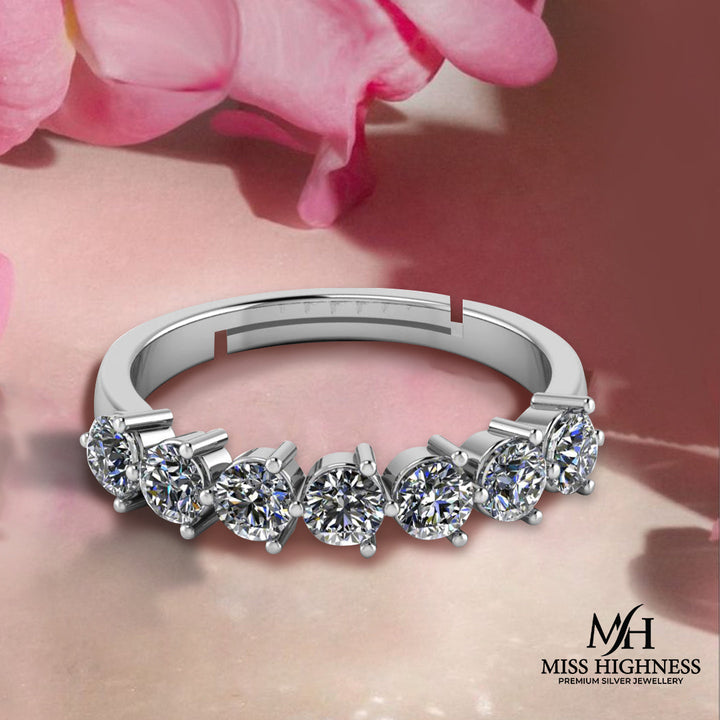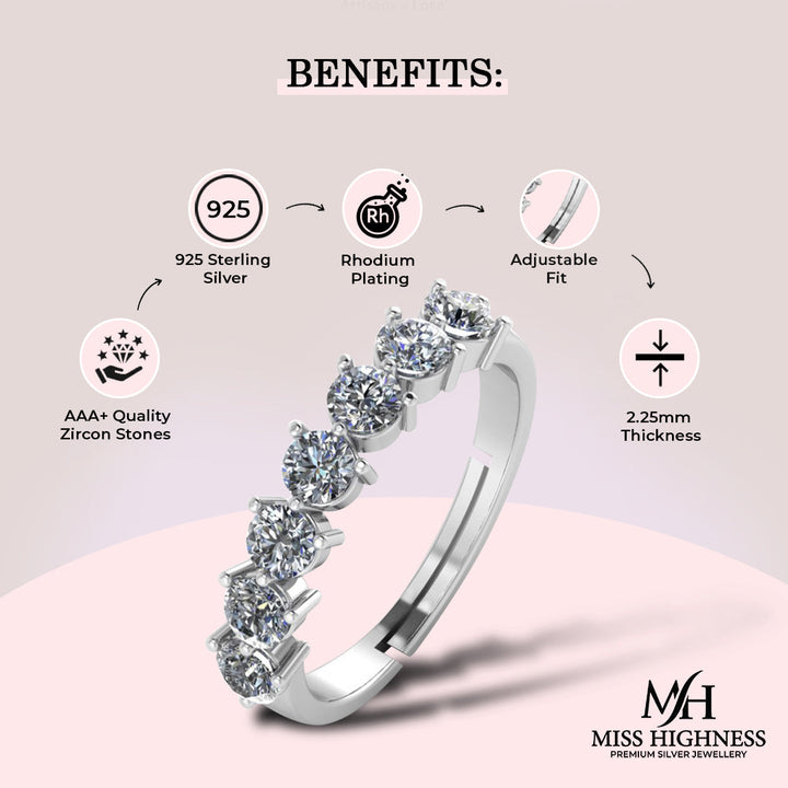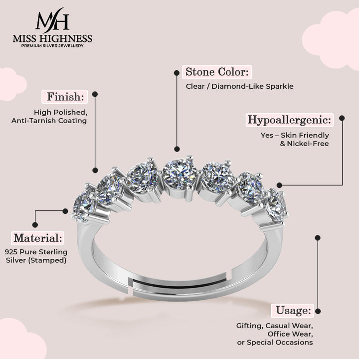 This band-style ring features a straight row of seven round-cut AAA+ zircon stones secured in a durable 4-prong setting. Each stone offers diamond-like sparkle, set atop a sleek band of pure 925 sterling silver, finished with rhodium plating for shine and protection. The band is adjustable for a flexible, comfortable fit.