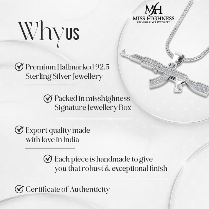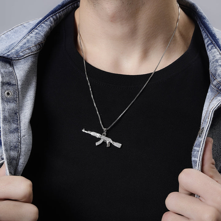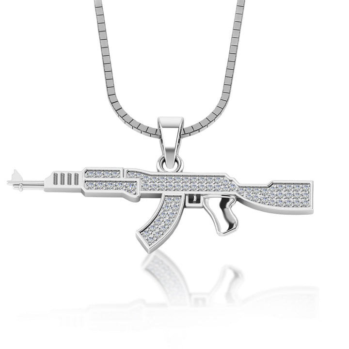 Add a touch of badass to your style with this 925 pure silver AK47 gun pendant, iced in white for a cool, edgy look. Perfect for the stylish man who isn't afraid to make a statement. (Warning: may cause envy among friends.)