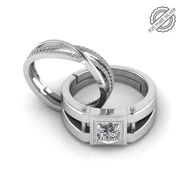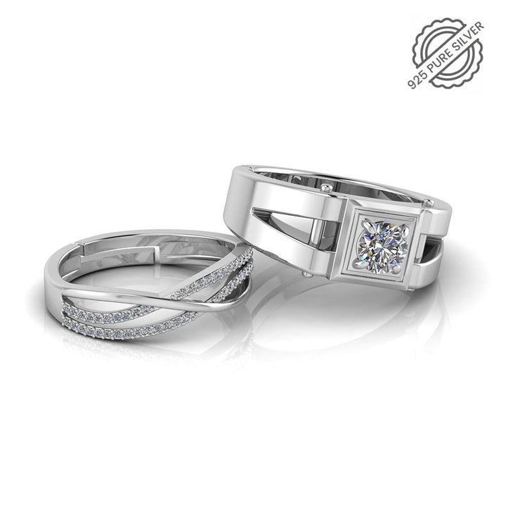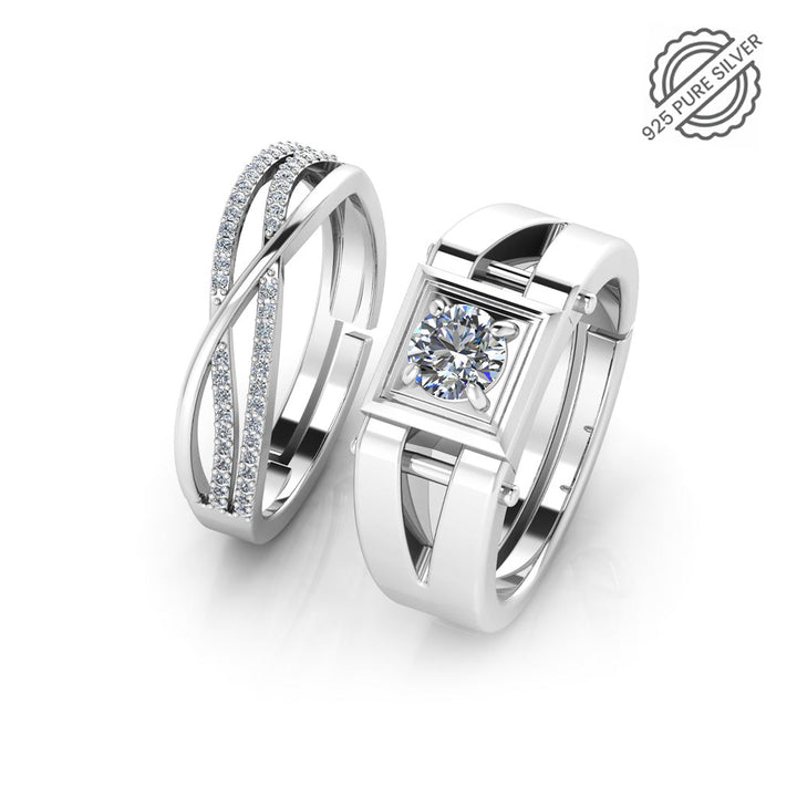 925 Pure Sterling Silver Zircon Studded Three Line Free Size and Stardom Mens Couple's Ring