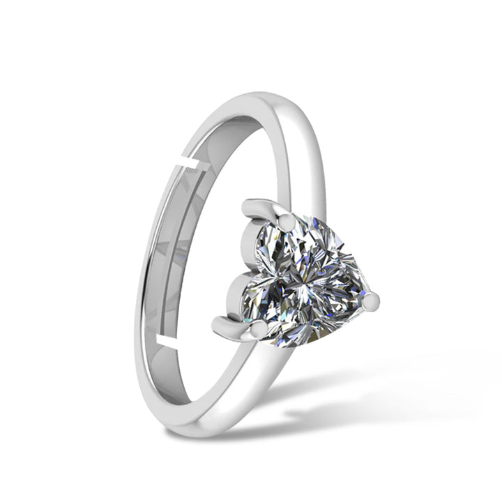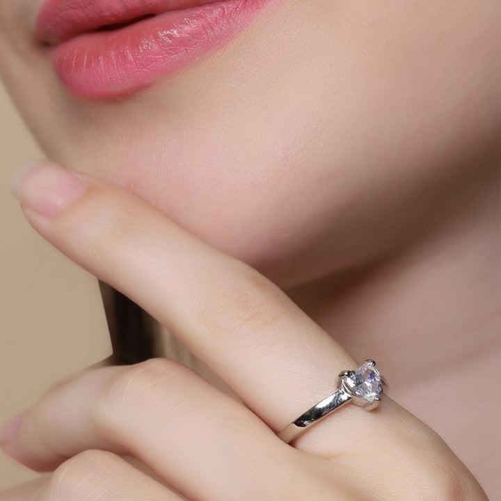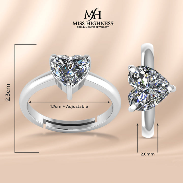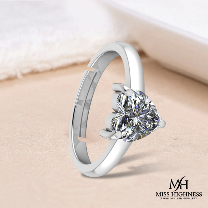 A flawless heart-shaped AAA+ zircon stone rests at the center of a high-polished silver band. Finished with rhodium plating and designed to adjust smoothly for a perfect fit.
