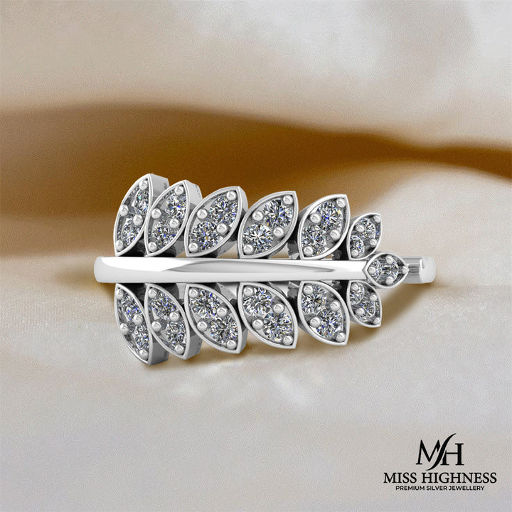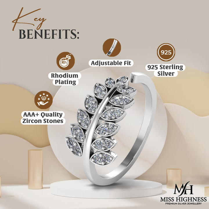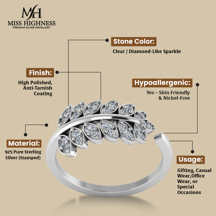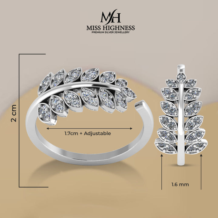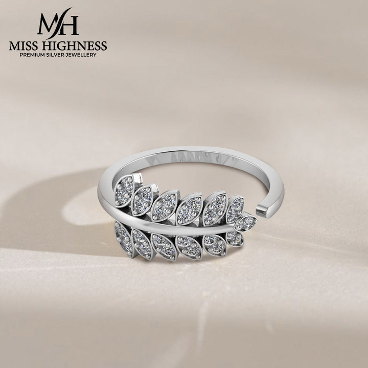 925 Sterling Silver leaf shape zircon studded Freesize Ring