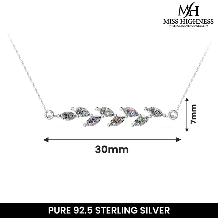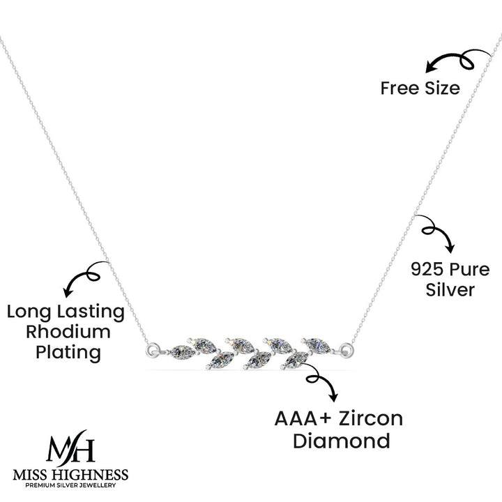 Enhance your elegance with the Miss Highness 925 Pure Silver Necklace, adorned with AAA+ Zircon Diamonds for a sparkling finish. Featuring a delicate leaf design pendant, this timeless piece is plated with long-lasting rhodium for exceptional shine and durability. The free-size chain ensures a comfortable fit, making it perfect for daily wear or special occasions. An ideal gift choice for women who appreciate luxury and style.