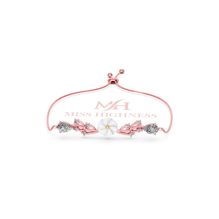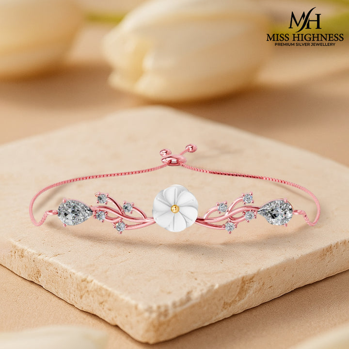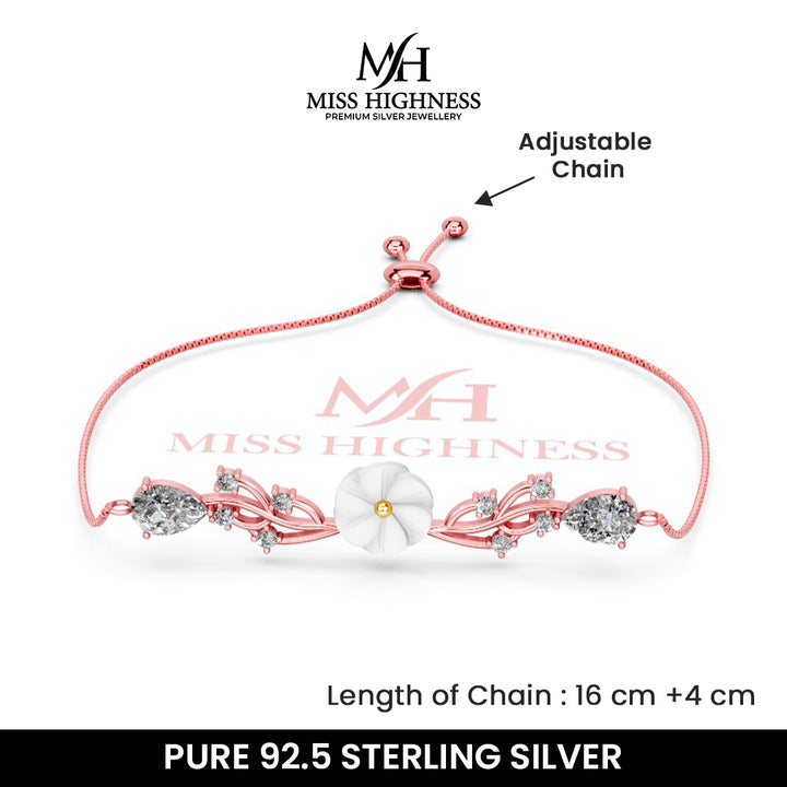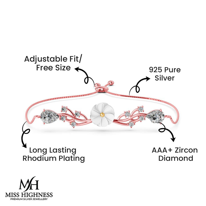 Add a touch of floral elegance to your jewellery collection with the Miss Highness 925 Pure Silver Adjustable Bracelet, designed for women who appreciate refined craftsmanship and modern beauty. This stunning bracelet features a charming central flower motif, accented by brilliant AAA+ Zircon Diamonds in a unique teardrop and cluster arrangement. Crafted from 925 pure silver and plated with luxurious rose gold along with a long-lasting rhodium finish, it ensures exceptional shine, durability, and tarnish resistance. The adjustable free-size fit makes it comfortable for all-day wear, whether for casual outings, office attire, or special occasions. With its blend of floral grace and sparkling brilliance, this bracelet is a perfect gift for birthdays, anniversaries, or festive celebrations. Experience the perfect combination of style and premium quality with Miss Highness Premium Silver Jewellery.