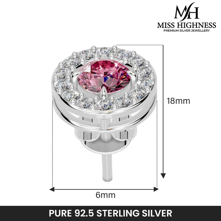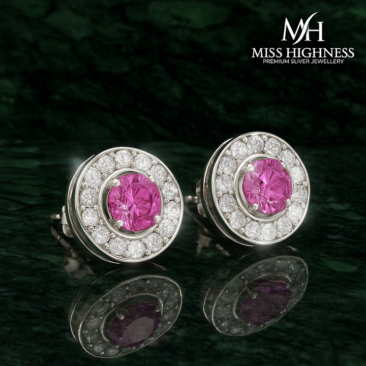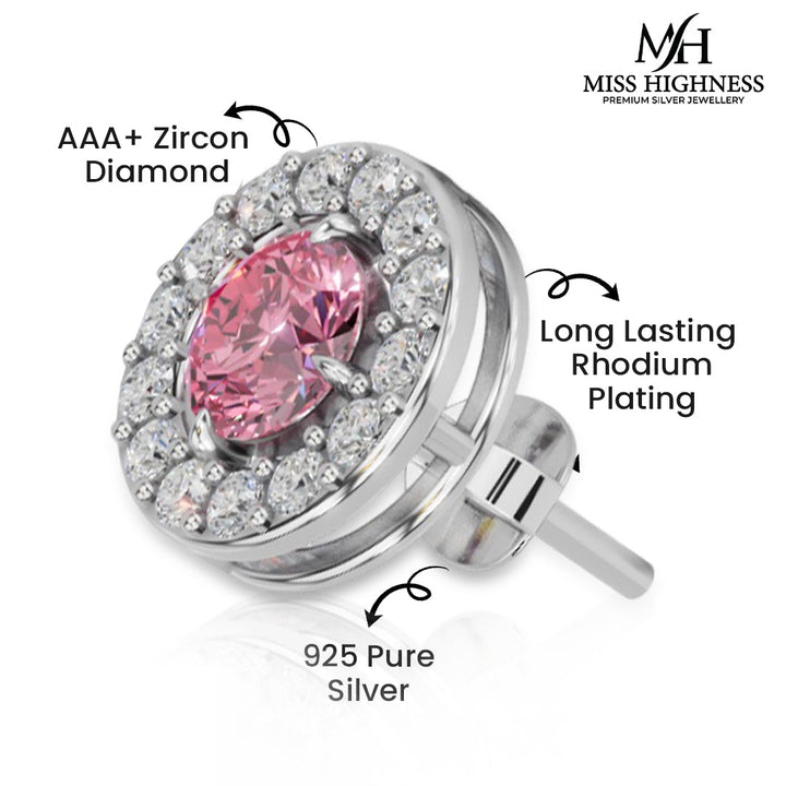 Add a pop of color and sophistication to your jewellery collection with this stunning pink zircon stud earring from Miss Highness. Expertly crafted from 925 pure sterling silver and finished with long-lasting rhodium plating, this piece offers durability, brilliance, and resistance to tarnishing. At the center is a vivid pink AAA+ zircon diamond, beautifully surrounded by a halo of sparkling white stones that enhance its radiance.