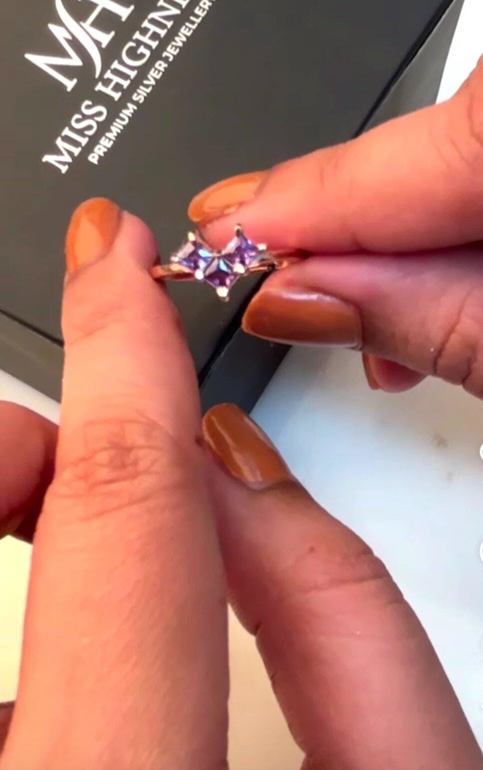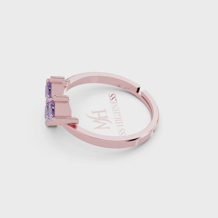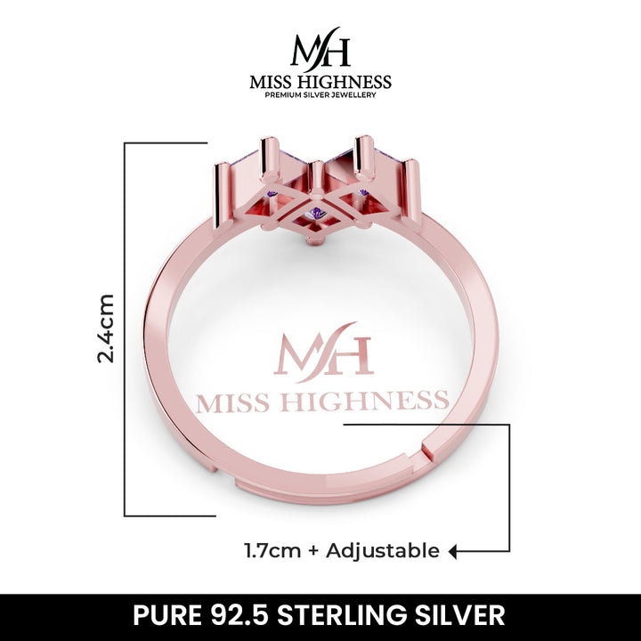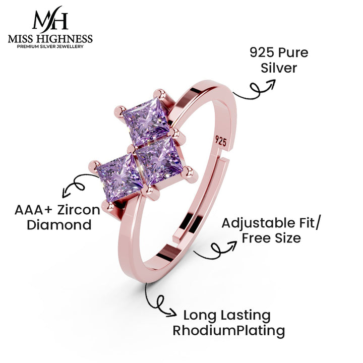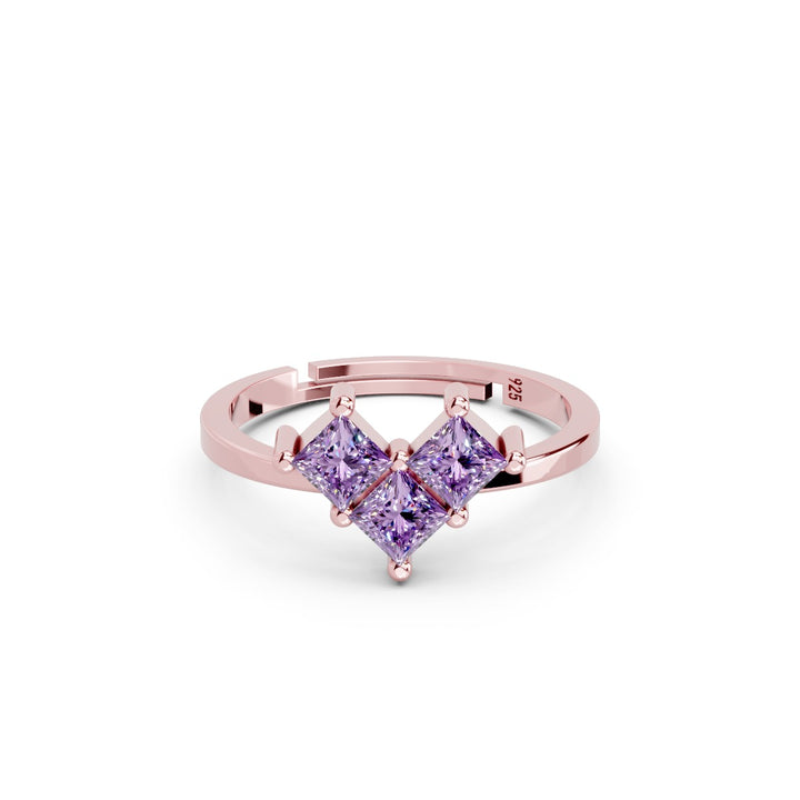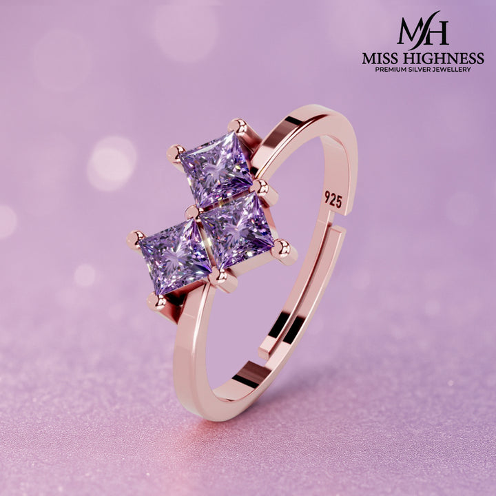 This elegant women’s ring is crafted from pure 925 sterling silver and finished with a luxurious rose gold plating. It features four princess-cut purple stones arranged in a modern, stylish setting. Perfect for adding a pop of color to your daily look or gifting on special occasions.