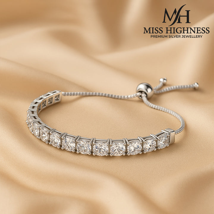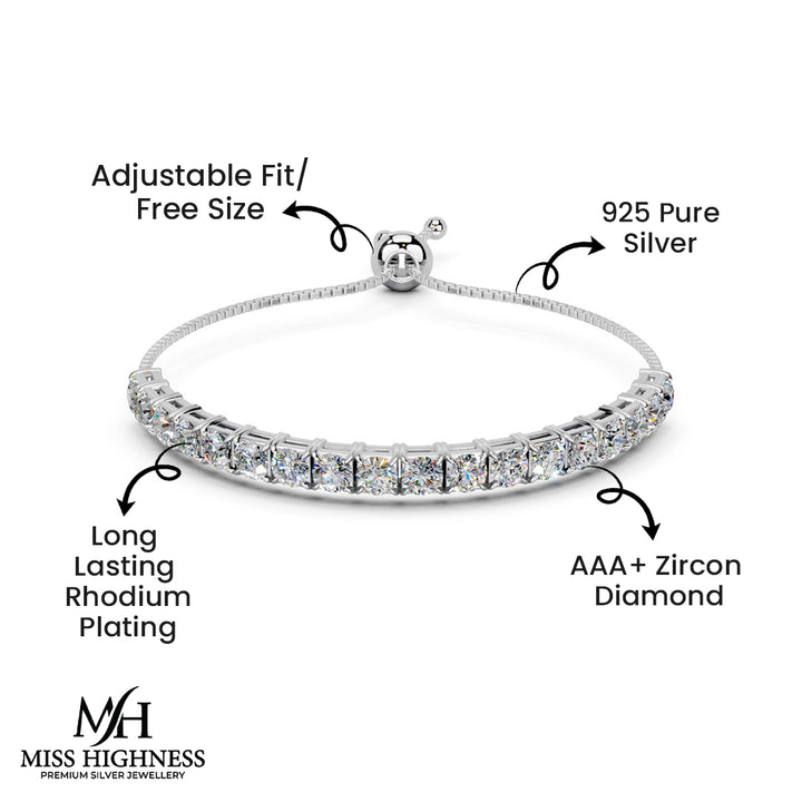 Add timeless elegance to your collection with this white zircon adjustable bracelet from Miss Highness. Crafted using certified 925 pure silver and finished with long-lasting rhodium plating, this bracelet exudes brilliance and luxury.