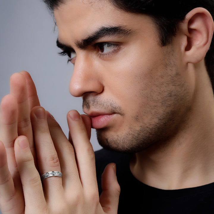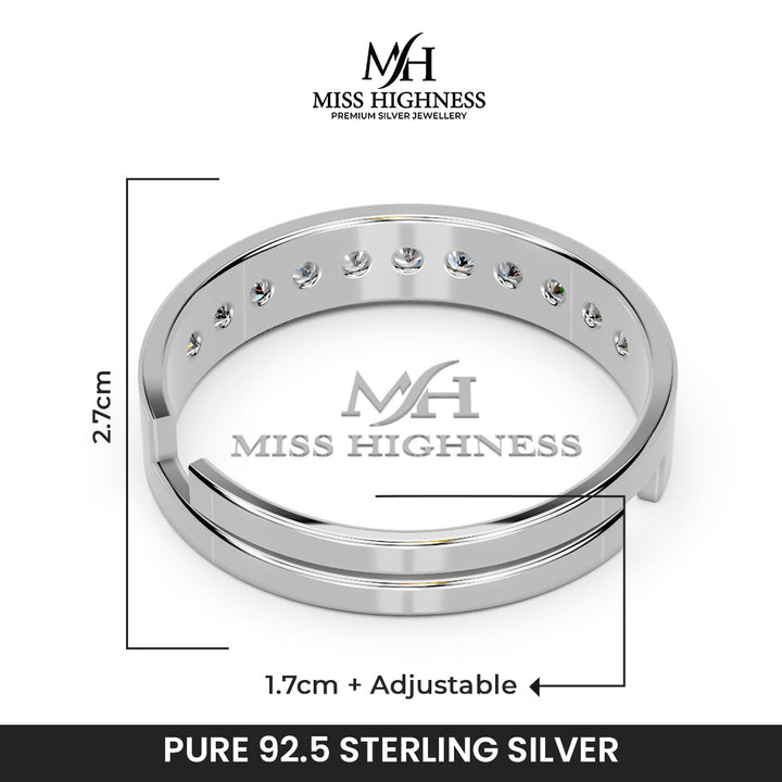 Elevate your style with this bold and luxurious men’s ring from the Miss Highness Premium Silver Jewellery collection. Crafted from high-quality 925 sterling silver, this ring showcases a powerful design with a brilliant-cut solitaire stone at its center, surrounded by rows of pavé-set cubic zirconia for unmatched sparkle and sophistication. The sleek band with its contemporary geometric edges adds a touch of modern elegance, making it a perfect choice for both formal occasions and everyday wear.