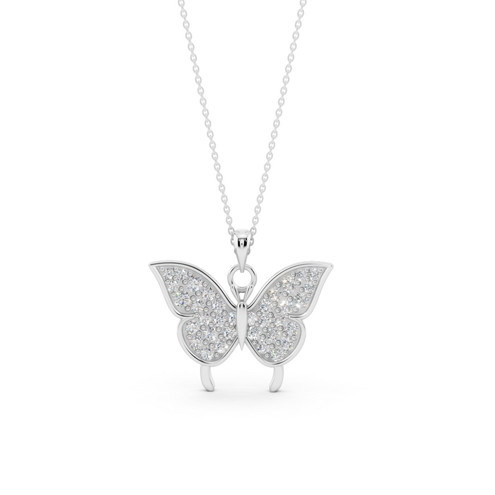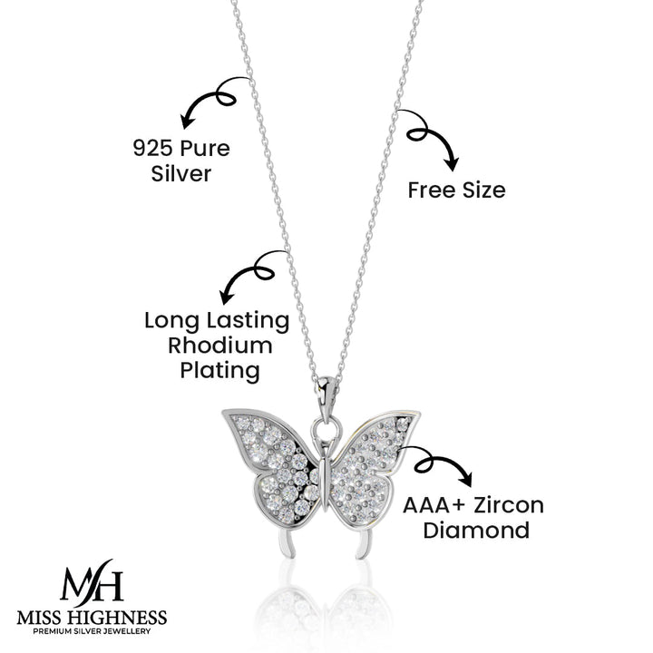 Delicate yet dazzling, this butterfly pendant necklace from Miss Highness brings a graceful charm to any look. Crafted in 925 pure sterling silver and finished with long-lasting rhodium plating, it resists tarnish while delivering a high-gloss, elegant finish. The butterfly pendant is encrusted with shimmering AAA+ zircon diamonds, capturing light from every angle for a sparkling appearance.