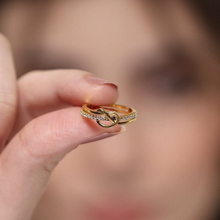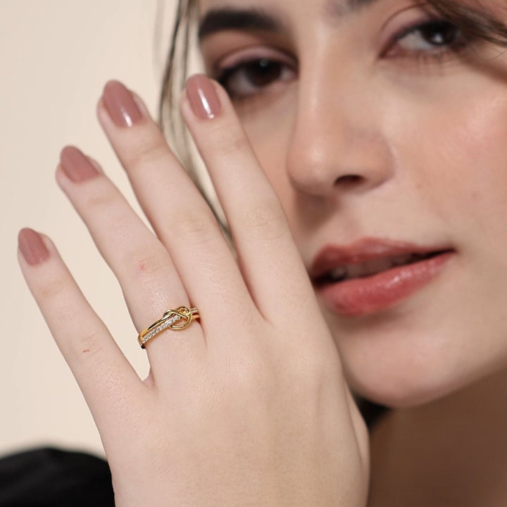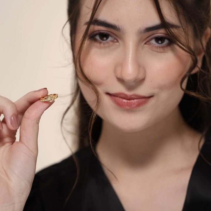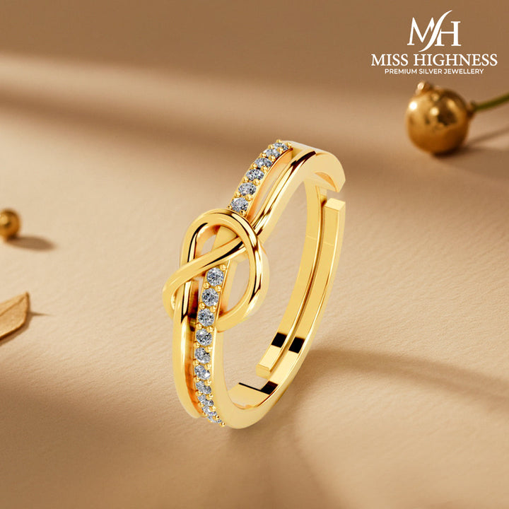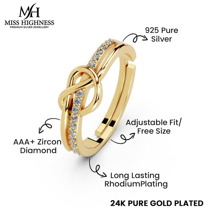 Crafted from premium 925 sterling silver and luxuriously plated with 24K gold, the Miss Highness Knot & Infinity Ring for women is a perfect blend of elegance and durability. The intricate knot design is adorned with brilliant cubic zirconia stones, symbolizing eternal love and unity. Adjustable for the perfect fit, this ring is ideal for anniversaries, birthdays, or special milestones, adding a timeless touch to any woman’s jewelry collection.