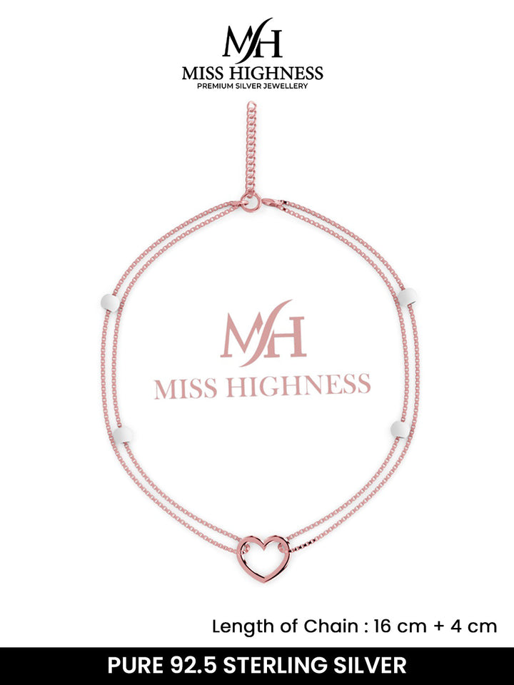 Elevate your jewellery collection with the Miss Highness 925 Sterling Silver Adjustable Heart Anklet, beautifully designed for women who love timeless elegance with modern charm. Crafted from authentic 925 sterling silver, this anklet is expertly finished with 24K pure rose gold plating and an additional long-lasting rhodium polish for enhanced durability and shine. The dual chain design is adorned with a delicate open heart charm, symbolizing love and grace, making it a perfect accessory for both everyday wear and special occasions.