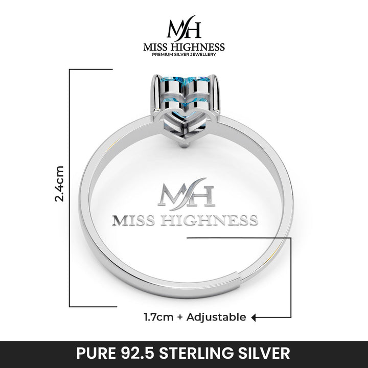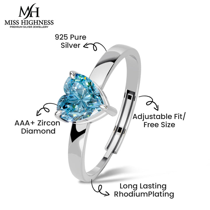 Fall in love with the charming elegance of this heart-shaped ring from Miss Highness Premium Silver Jewellery. Crafted from pure 925 sterling silver and finished with long-lasting rhodium plating, this ring is designed to offer both brilliance and durability. At its center sits a striking AAA+ blue zircon diamond, expertly cut into a heart shape to symbolize love, purity, and sophistication.