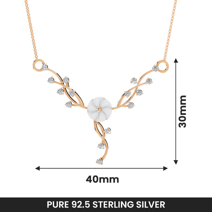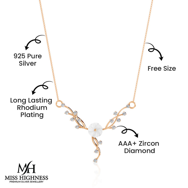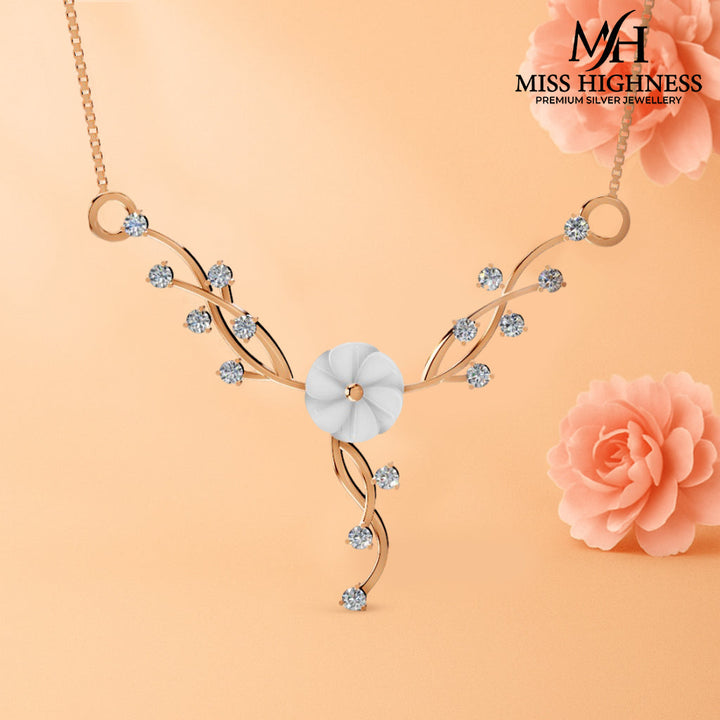 Grace your neckline with the timeless elegance of this floral pendant necklace by Miss Highness. Made from pure 92.5 sterling silver and finished with a rich rose gold polish, the pendant features a graceful floral motif highlighted by sparkling AAA+ zircon stones and a carved central white stone. The delicate 30mm x 40mm pendant adds a refined touch to your outfit, whether for a day out or a festive celebration.