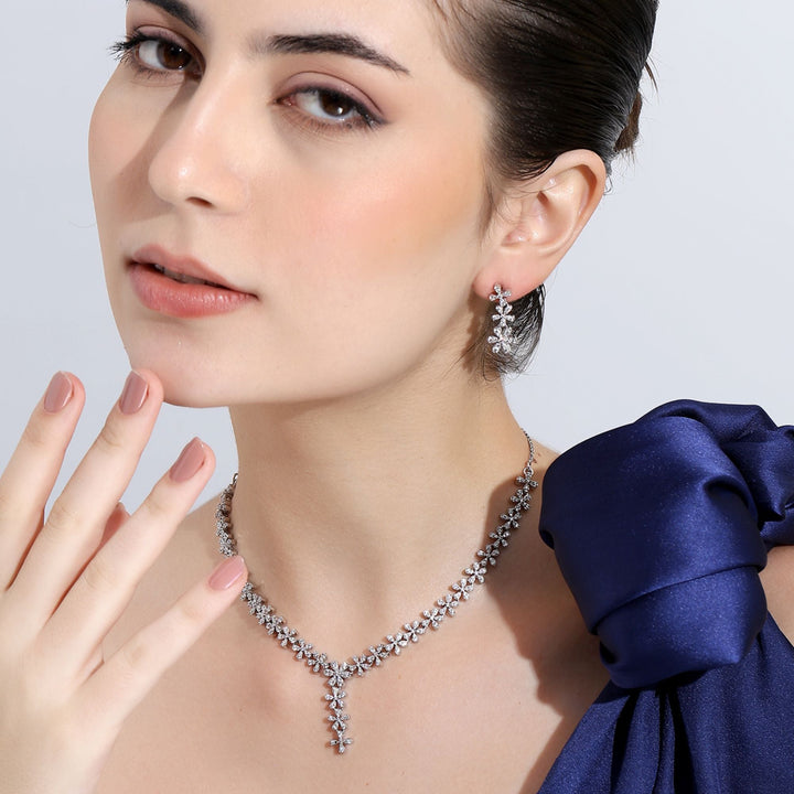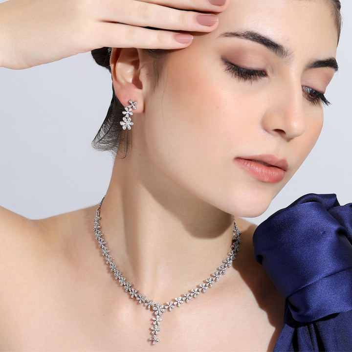 Elevate your elegance with this stunning floral necklace and earring set from Miss Highness, crafted in 92.5 pure sterling silver. Designed with intricate flower motifs and encrusted with premium AAA+ zircon diamonds, this set radiates brilliance and grace. The rhodium plating ensures long-lasting shine and protection, while the free-size chain offers adjustable comfort for all.