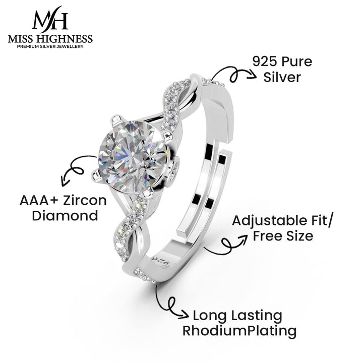 Elevate your style with the Miss Highness Infinity Twist Solitaire Ring. Crafted from premium 925 sterling silver, this design features a brilliant round-cut cubic zirconia centerpiece embraced by a graceful twist band adorned with sparkling accents. Adjustable for a comfortable fit, it’s perfect for engagements, anniversaries, or making everyday moments shine.