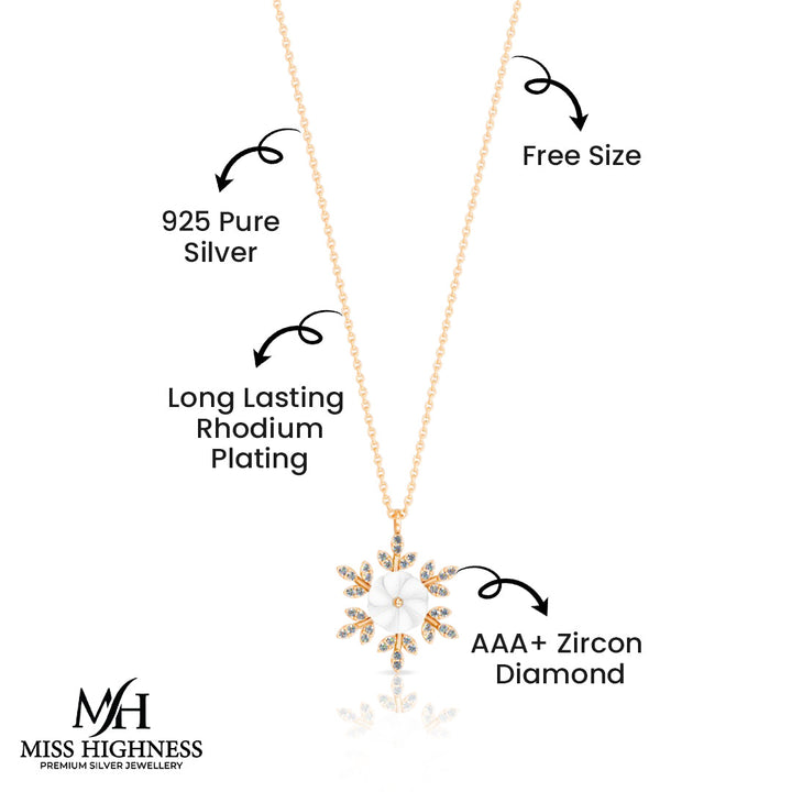 Elevate your elegance with this charming floral pendant necklace by Miss Highness, beautifully crafted in a rich rose gold finish. Featuring a unique design with shimmering AAA+ zircon leaves and a glossy white shell flower at the center, this piece brings together modern beauty and timeless grace.
