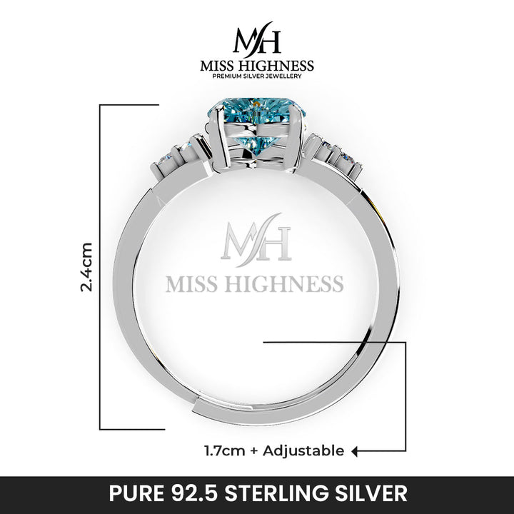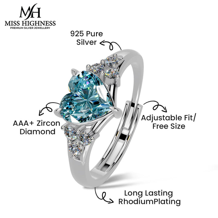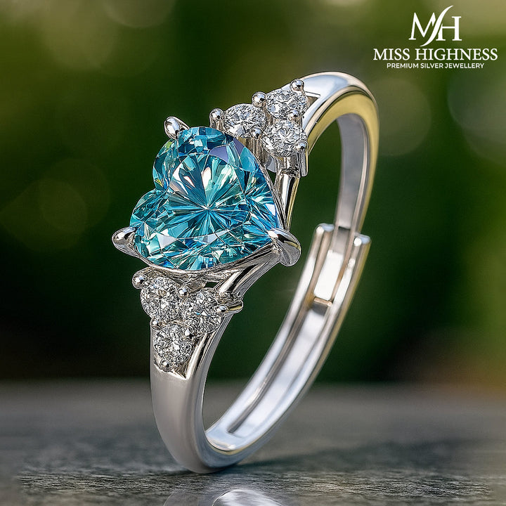 Fall in love with the charming elegance of this heart-shaped ring from Miss Highness Premium Silver Jewellery. Crafted from pure 925 sterling silver and finished with long-lasting rhodium plating, this ring is designed to offer both brilliance and durability. At its center sits a striking AAA+ blue zircon diamond, expertly cut into a heart shape to symbolize love, purity, and sophistication.