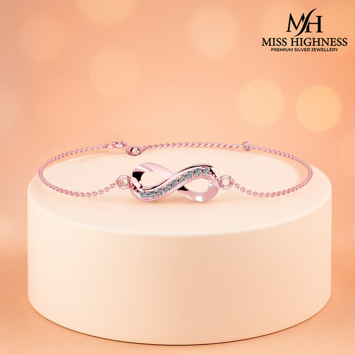 Elevate your elegance with the Miss Highness rose gold bracelet, masterfully crafted in 925 pure silver. Adorned with sparkling AAA+ zircon diamonds and a graceful floral centerpiece, this bracelet reflects sophistication and charm. The high-quality rhodium plating ensures long-lasting shine, while the adjustable fit offers comfort for all wrist sizes. A perfect blend of modern style and timeless beauty, ideal for gifting or personal wear.