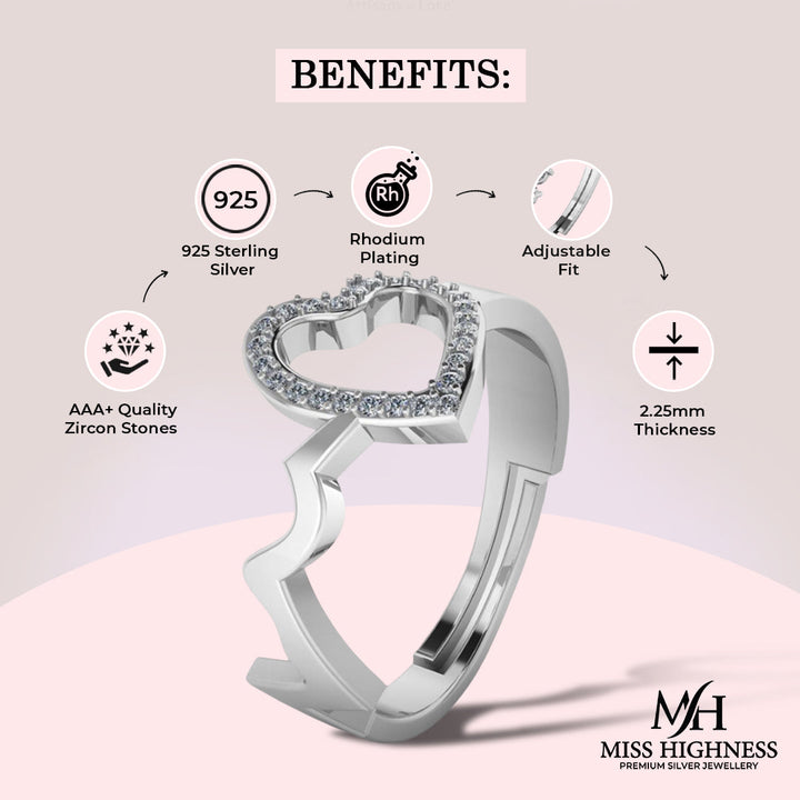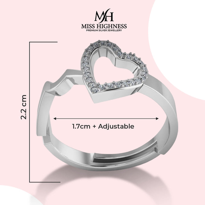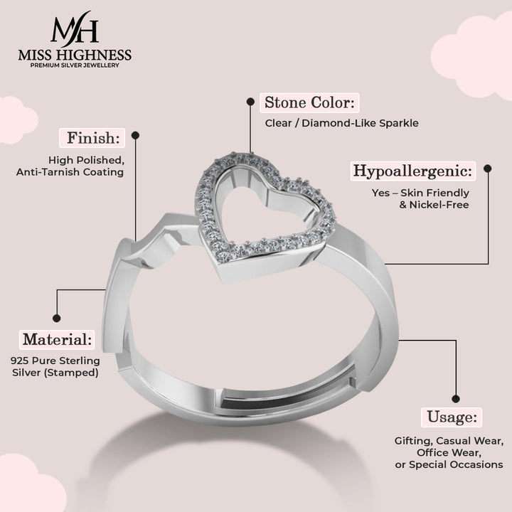 Treat yourself to a touch of elegance with our Pure 925 Silver Heart Shape Adjustable Ring for Women. Crafted from high-quality silver, this ring exudes both simplicity and sophistication. Adjust it to your perfect fit and wear it for any occasion - a heartwarming addition to any outfit. (Heart on your sleeve not included)