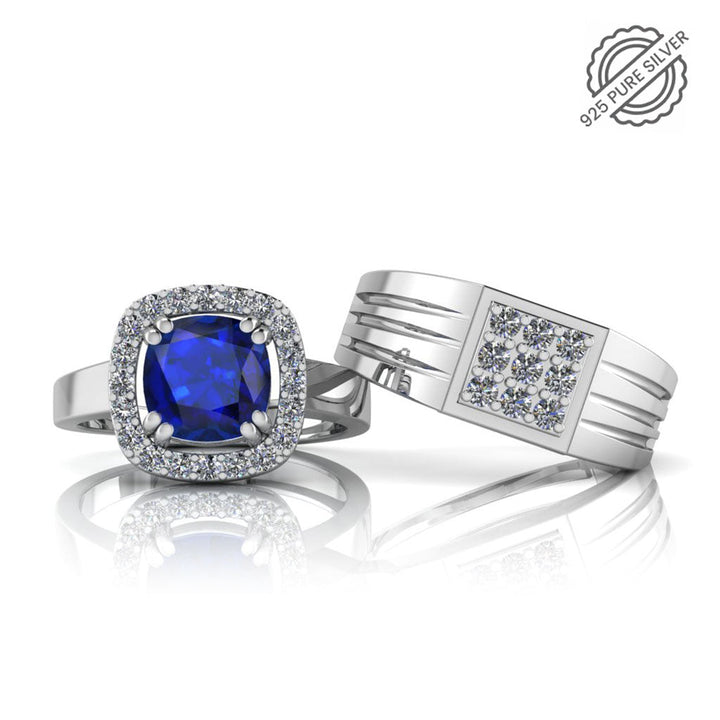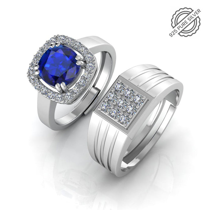 Pure 925 Silver Special Cluster Blue Stone Sapphire Couples Ring